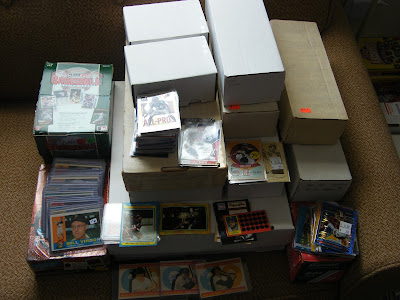This photo, which I ended up taking pieces from (and another shot from a slightly different angle), shows my show haul (the loose cards) piled on top of some of the bulk boxes I got from Stuart or other vendors. I didn't buy all that at one show. :)